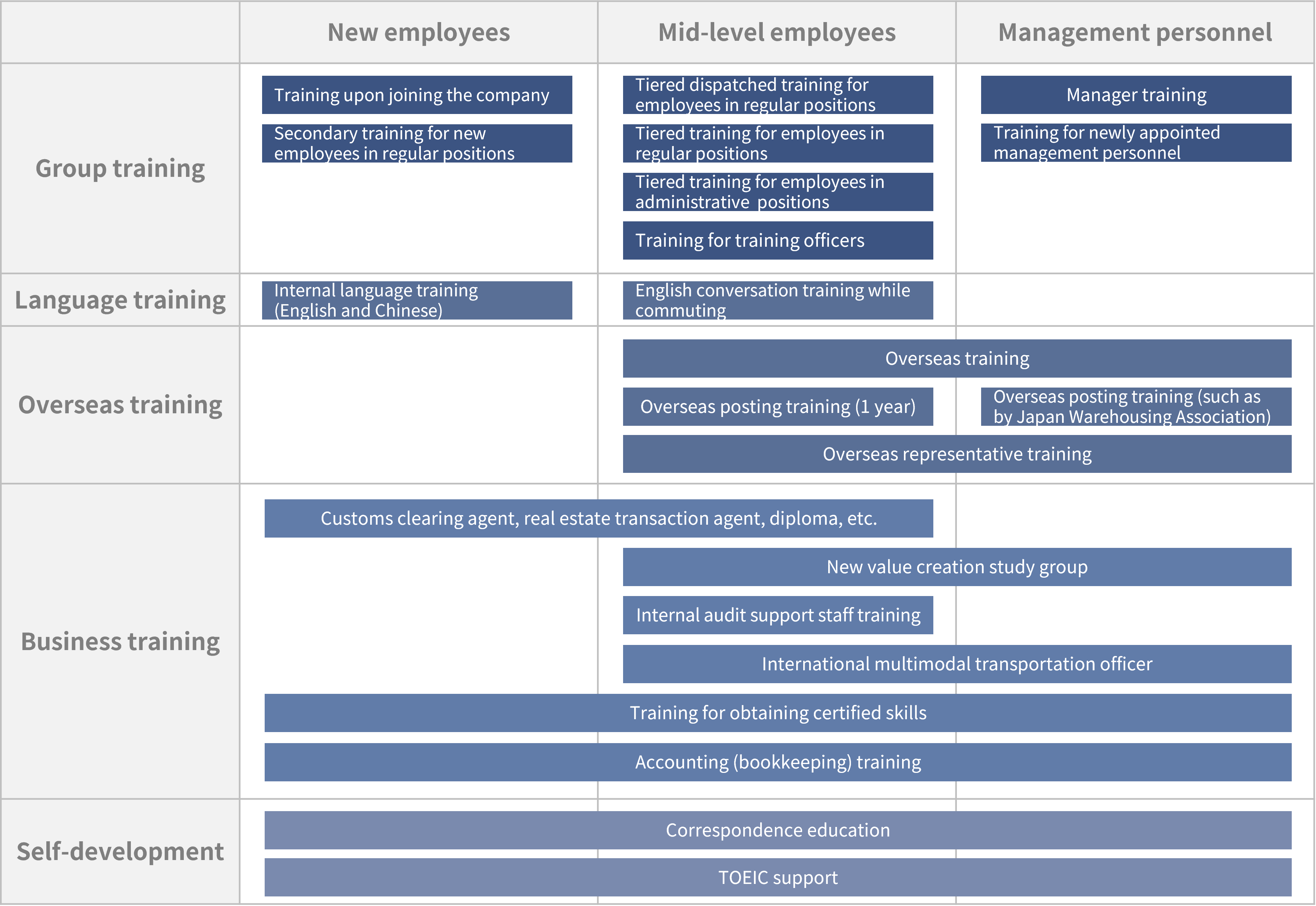 In the Moving Forward to 2030 long-term vision, the Company states that it will provide multifaceted support for the overseas expansion of customers, further develop global logistics and increase operational capacity, recognizing that the development of global human resources is essential. In order to achieve this, the Company encourages employees to obtain understanding of different cultures, communication skills and overseas logistics knowledge and skills required for working overseas through one-year overseas posting trainings and opportunities for overseas training, etc. to gain a deeper understanding of local logistics conditions.
